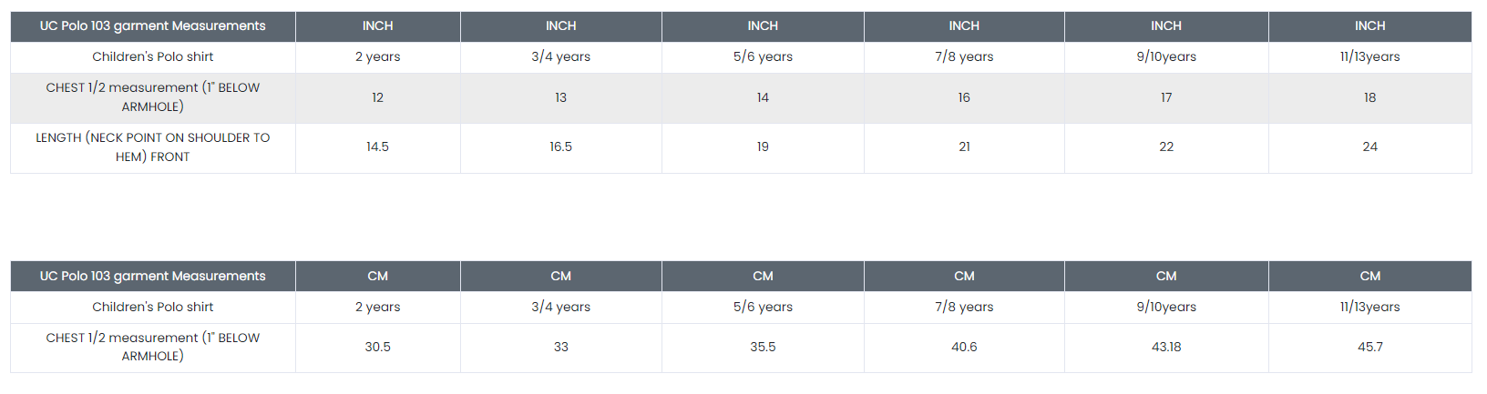 Children 50% Polyester 50% Cotton, Reactive Dyed, Knitted Collar & Hemmed Sleeve, Taped Neck, Name Tag on Neck Label, 3 Self Coloured Button Placket, Enzyme washed for extra soft hand-feel and reduced shrinkage